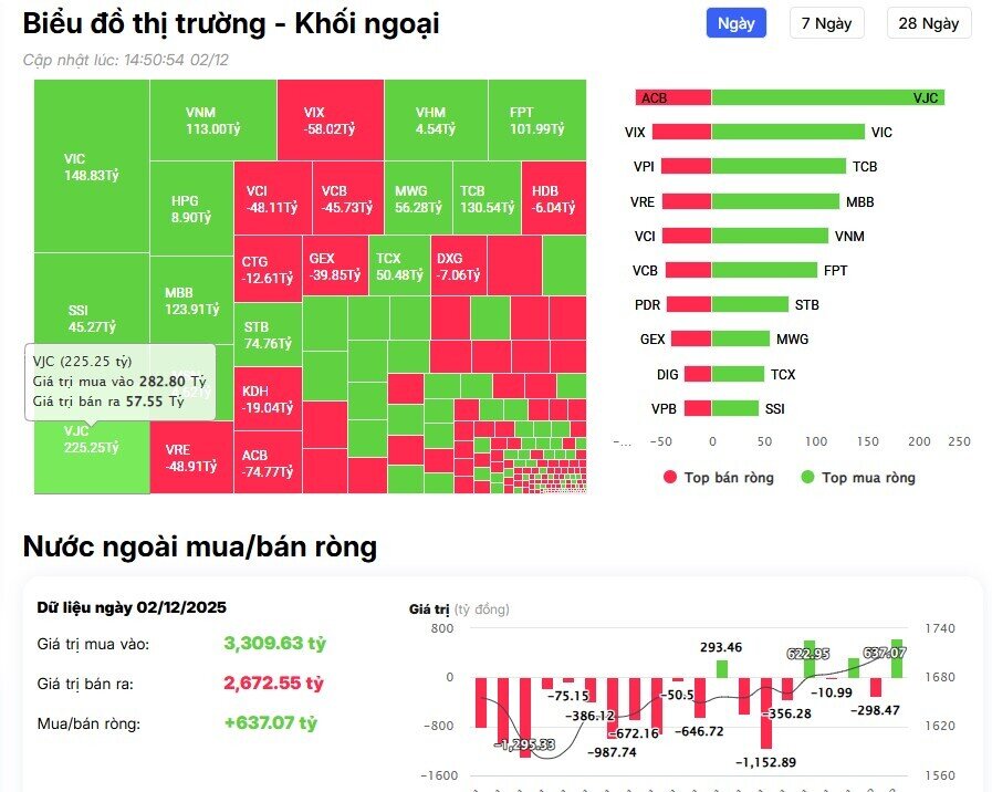 Những mã được mua nhiều là VJC (225 tỷ đồng), VIC (148 tỷ đồng), TCB (130 tỷ đồng), MBB (123 tỷ đồng), VNM (113 tỷ đồng), FPT (101 tỷ đồng)…