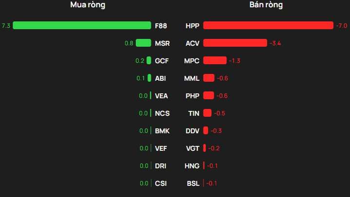 Chiều mua, cổ phiếu F88 được khối ngoại mua 7,3 tỷ đồng. Theo sau, MSR và GCF cũng được mua ròng mỗi mã vài trăm triệu đồng.