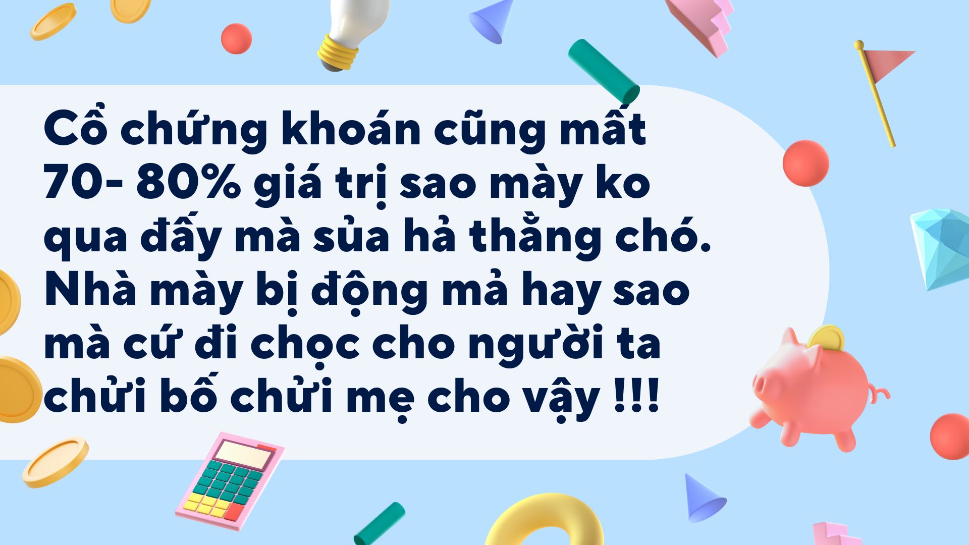 Dạng này không cần trả lời nhé vì không hiểu nổi. Traiding thì ăn ít thôi không giỏi phúc mỏng thì về máng lợn nhé. Haha voi đú chuột trù cũng đú. Hiểu chưa? Đủ phúc có ăn nhưng không làm nên sự nghiệp nhé! Đầu tư mới là bền ăn dày vì chờ DN lớn hiểu chưa! Hài vãi chấm dứt ở đây nhé không trả lời nữa đâu. Haha