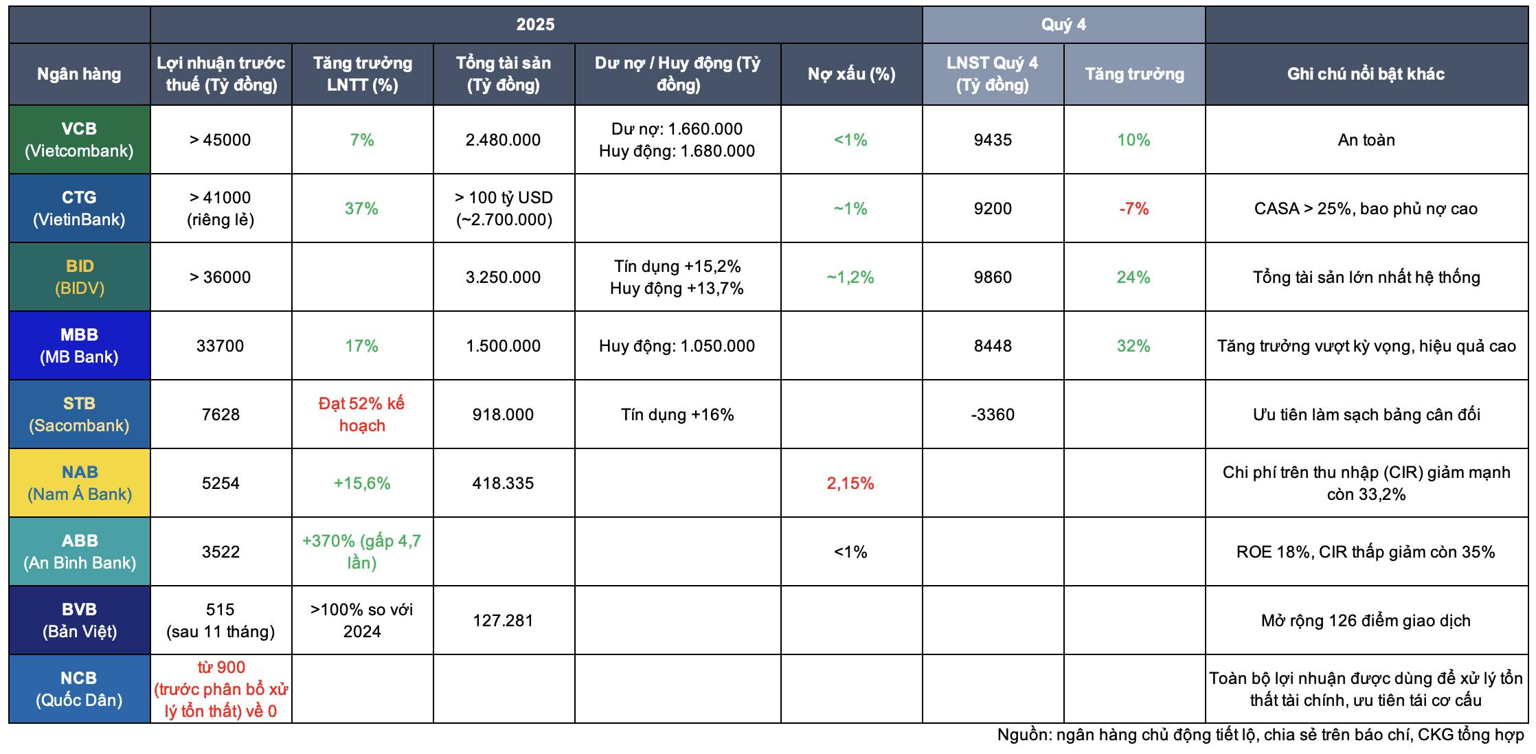 Cuối tháng mới có báo cáo chính thức, nhưng dưới đây là thông tin từ phát biểu chính thức hoặc chia sẻ trên báo chí của các ngân hàng KHÔNG PHẢI TIN ĐỒN, được CKG - Giáo Dục Tài Chính tổng hợp lại để tiện theo dõi: