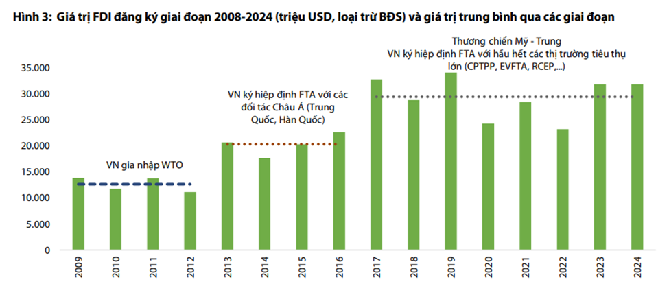 Trong kịch bản tiêu cực nhất (Việt Nam tiếp tục bị áp mức thuế quan cao hơn các quốc gia trong khu vực ASEAN), chúng tôi cho rằng dòng vốn FDI sẽ bị ảnh hưởng mạnh, và giá trị FDI đăng ký có thể suy giảm về tương đương giai đoạn 2013-2016 (khi thương chiến bắt đấu, và Việt Nam được chú ý tới như một địa điểm phù hợp để dịch chuyển chuỗi sản xuất), tương đương mức suy giảm 30% về giá trị. Tuy nhiên, chúng tôi kỳ vọng sẽ có những triển vọng tốt hơn (so với kịch bản này), nhờ những lợi thế đến từ: