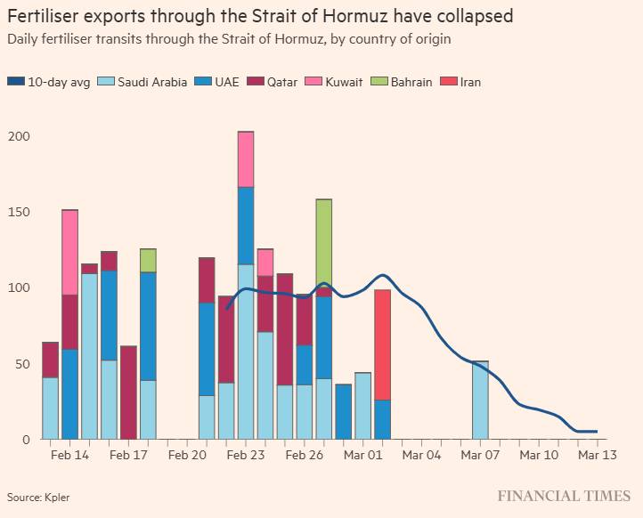 Theo dữ liệu từ công ty phân tích hàng hóa Kpler, khoảng một nửa trong tổng số 2,1 triệu tấn urê dự kiến được xuất khẩu trong hai tuần qua đã bị gián đoạn. Bên cạnh đó, thêm 1,1 triệu tấn phân bón và nguyên liệu đầu vào cho phân bón — bao gồm 570.000 tấn urê — hiện đang bị mắc kẹt tại khu vực Vùng Vịnh, hoặc đang trong quá trình bốc hàng, hoặc đã nằm trên tàu nhưng chưa thể rời cảng.