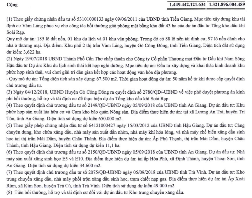 Đồng thời, trong 1.449 tỷ đồng ở khoản mục xây dựng cơ bản dở dang, ngoài các dự án đầu tư nhà máy, kho trữ, kho trung chuyển…, PSH còn đang thực hiện vài dự án bất động sản như Dự án Vàm Láng quy mô 185 lô đất nền, 1 khu du lịch và 1 khu văn phòng; dự án khu du lịch sinh thái Phong Điền có tổng diện tích sàn xây dựng 67.500 m2 có thời gian hoạt động 50 năm kể từ ngày cấp quyết định chủ trương đầu tư.