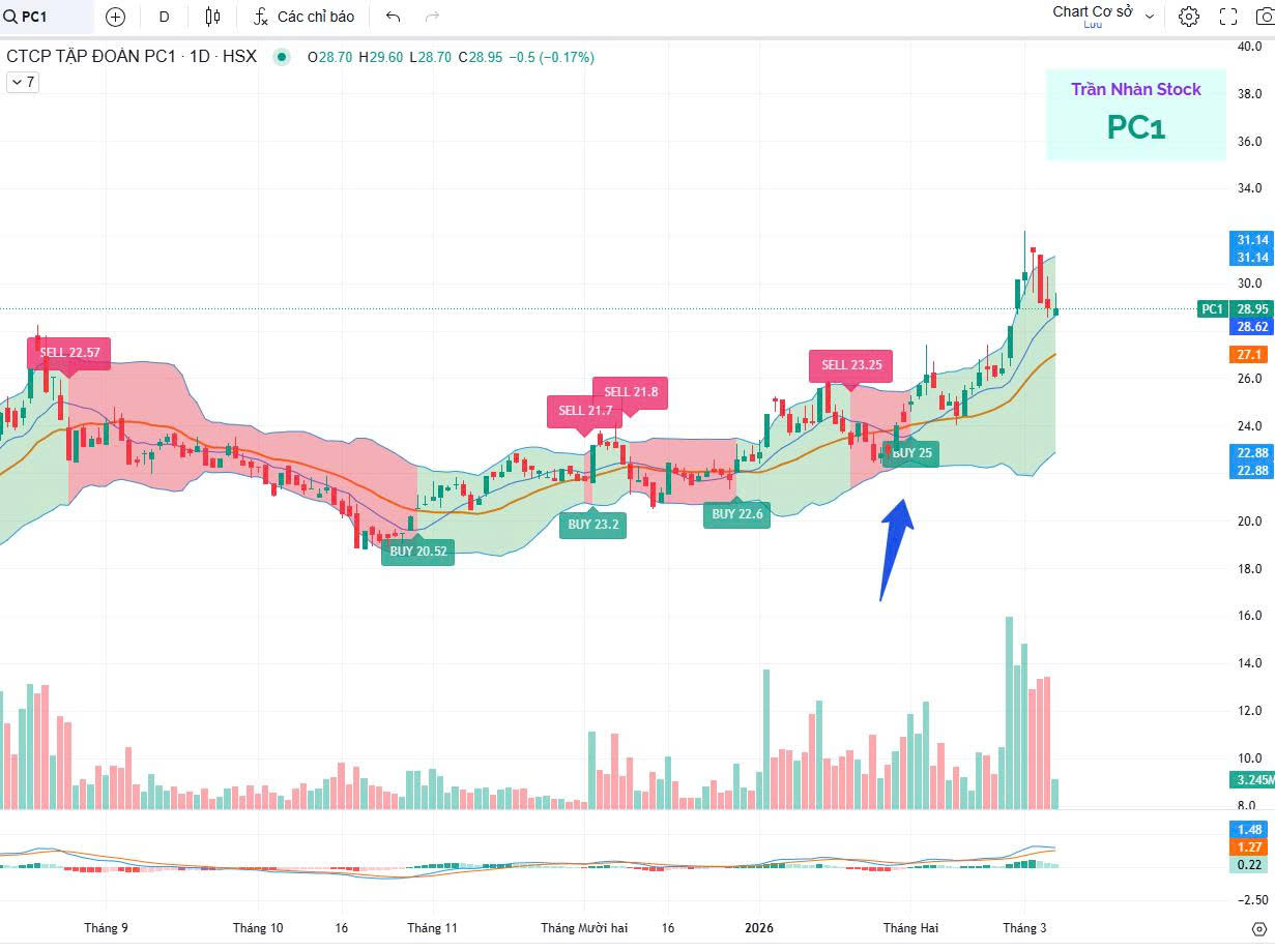 -Chart tuần PC1 đã tạo đáy T11/2022 , tích lũy năm 2023 ,2024,2025 và chính thức thoát nền tích lũy vào trend tăng từ T2/2026 ;