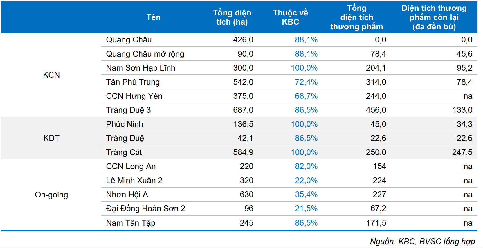 Hiện tại, KCN Tràng Duệ 3 vẫn trong giai đoạn đền bù giải phóng mặt bằng, trong tổng số 687ha quy hoạch, KBC đã đền bù 200ha, còn lại 487 ha cần phải đền bù. Diện tích thương phẩm ước tính trên diện tích đã đền bù khoảng 133ha. BVSC kỳ vọng, diện tích thương phẩm này sẽ được đưa vào kinh doanh năm 2022 và sẽ bán hết trong 2023. Với giá thuê 130 USD/m2, doanh thu quỹ đất đã đền bù của dự án Tràng Duệ 3 ước đạt 4.633,9 tỷ đồng. Doanh thu này sẽ ghi nhận trong giai đoạn 2022-2024. Biên lợi nhuận gộp ước tính theo giá thuê hiện tại là 56%.