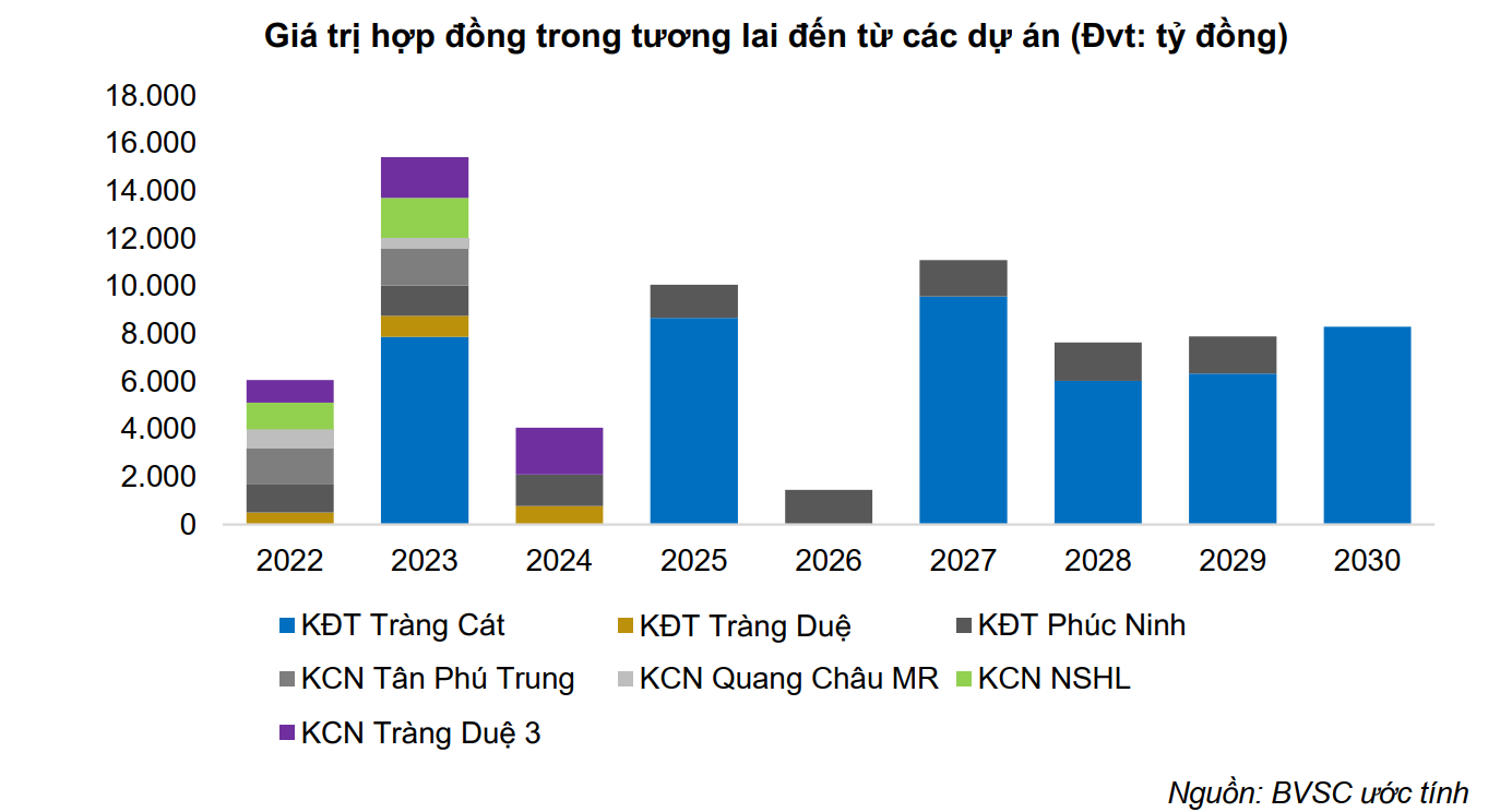 Với kỳ vọng ghi nhận doanh thu và lợi nhuận từ KĐT Tràng Cát vào năm 2023, BVSC dự phóng doanh thu và lợi nhuận của KBC năm 2023 lần lượt đạt 11.777,3 tỷ đồng (+205,4% so với số dự phóng 2022) và 4.867,5 tỷ đồng (+43,7% so với s dự phóng 2022). Lưu ý rằng, trong khoản lợi nhuận dự phóng 3.387,5 tỷ đồng của 2022, có 2.412,2 tỷ đồng đánh giá lại tài sản.
