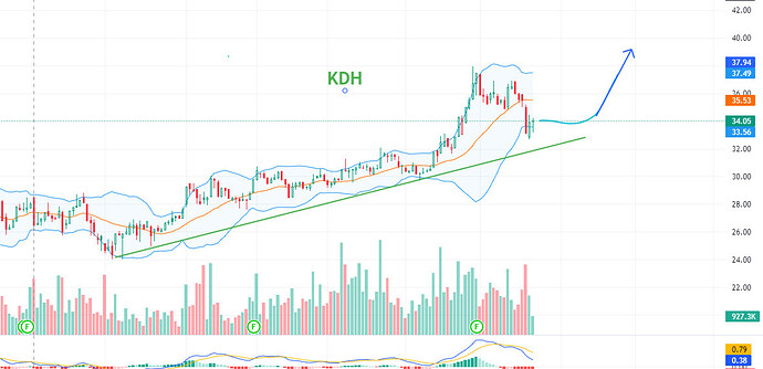 - Sau giai đoạn tích lũy đi ngang liên tục từ tháng 4 năm 2023 đến hiện tại KDH đã có dòng tiền vào mạnh và vượt qua vùng đỉnh cũ quanh 32 với dòng tiền gia tăng.