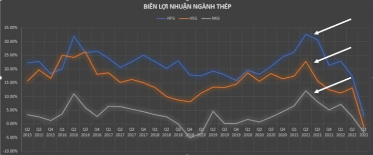 ❖ Biên lợi nhuận năm quý 3/2021 gần 30% hiện tại là 3%. Giá thép tạo đỉnh vào quý 2.2021 nhưng giá cổ phiếu ngành thép tạo đỉnh quý 3.2021. Nếu để ý thì giá thép tạo đỉnh thì cổ phiếu đạt đỉnh, giá thép tạo đáy thì cổ phiếu tạo đáy. Hiện tại, Mẫn chưa dám khẳng định giá cổ phiếu đã đạt đáy chưa vẫn cần phải theo dõi trong quý 4 nhưng nhìn về biên lợi nhuận của các DN cùng ngành HSG hay NKG thì thấy rõ ràng HPG chiếm ưu thế về lợi thế cạnh tranh. Biên lợi nhuận của HSG và NKG thậm chí âm luôn.