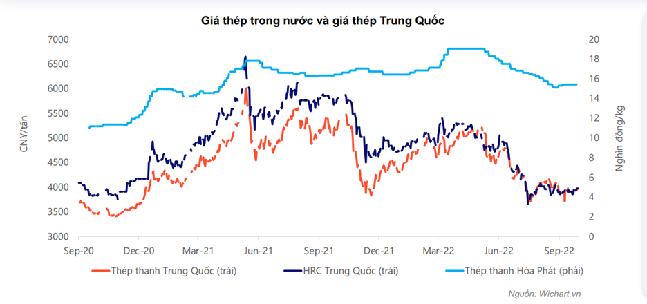 • Trải qua nhiều giai đoạn tăng giảm, giá thép thanh Trung Quốc hiện thấp hơn 9% so với mức đầu năm. Trong khi đó, giá thép trong nước giảm khoảng 6%. Lưu ý rằng, giá thép trong nước vẫn đang cao hơn 50% so với mức giá trước dịch, trong khi đó giá thép Trung Quốc cao hơn khoảng 17%.