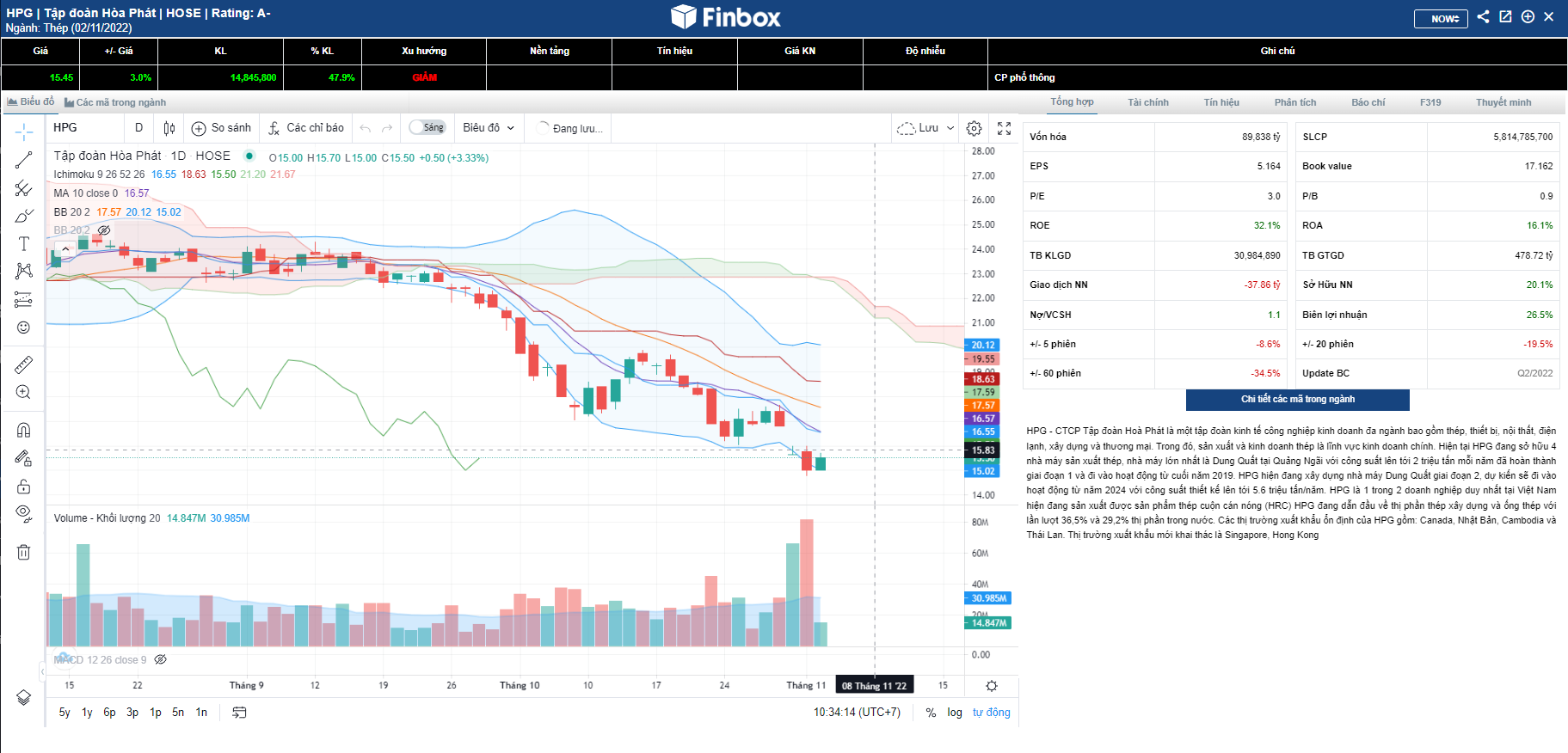 Trong phiên ngày 02/11 HPG đã cân bằng quanh mức giá 15. Tuy nhiên, chiều mai sẽ là lượng hàng 82 triệu cổ phiếu ngày 01/11 về tài khoản. Có thể thấy nguồn cung lơ lửng rất nhiều. Áp lực bán sẽ gia tăng khi HPG mất mốc 15 và sẽ trong quá trình mò đáy tiếp. Ngược lại nếu giữ được mốc 15 thì nền mới sẽ được thiết lập