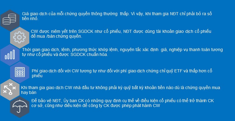 Dễ dàng tiếp cận: Nhà đầu tư có thể dễ dàng đăng ký mua CW vào thời điểm tổ chức phát hành chào bán tại thị trường sơ cấp hoặc mua trên thị trường thứ cấp sau khi CW được niêm yết trên SGDCK. Ngoài ra nhà đầu tư không bị hạn chế về tỷ lệ sở hữu trừ việc không được giao dịch ký quỹ đối với CW