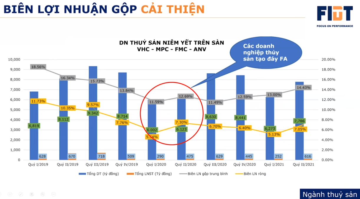 Ngoài việc nhu cầu từ các thị trường lớn phục hồi, chuyên gia đến từ Mirae Asset đánh giá một yếu tố tạo nên sức bật khác cho ngành thủy sản Việt Nam đến từ việc giá bán cá tra và giá tôm cũng bắt đầu tạo đáy và đi lên. Biên lợi nhuận gộp các doanh nghiệp thủy sản niêm yết đã được cải thiện lên mức 14,4% trong quý 2/2021. Trong bối cảnh chi phí đầu vào, cước vận tải tăng cao trong nửa đầu năm 2021, việc lợi nhuận cải thiện cho thấy các doanh nghiệp thủy sản có khả năng chuyển giá vào tay người tiêu dùng cuối cùng, từ đó đảm bảo cho nguồn doanh thu cũng như khuếch đại lợi nhuận của các doanh nghiệp trong ngành.
