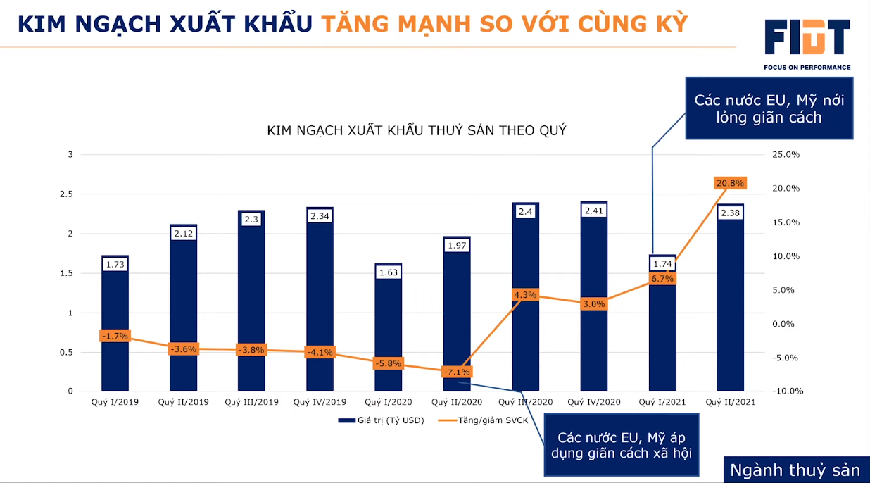 Nhìn lại trong quá khứ, hồi quý 2/2020, khi dịch bệnh COVID-19 bắt đầu bùng phát và lây lan trên toàn cầu, khi đó kim ngạch xuất khẩu thủy sản của Việt Nam đã sụt giảm, cộng thêm sự mất cân đối khi cung vượt quá cầu trong năm 2019 trước đó, có thể nói rằng ngành thủy sản trong năm 2020 gần như đã tạo đáy.