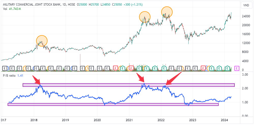 Chu kỳ tăng giá tiếp theo của MBB cũng lập lại điều tương tự khi tăng từ mức giá 6-7,000 lên 23-24,000 từ năm 2020 đến năm 2021. Với P/B tăng từ 1x lên 2.2x. Sau đó giá cổ phiếu bắt đầu sụt giảm mạnh.