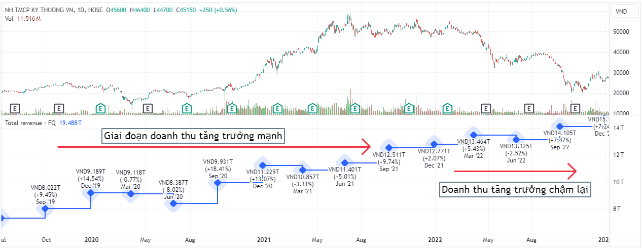 Trong giai đoạn 2020-2021, nếu nhà đầu tư mua TCB vì đây là một trong những cổ phiếu có tốc độ tăng tưởng tốt nhất ngành. Thì bước sang nữa cuối năm 2021, tốc độ tăng trưởng doanh thu của TCB đã có sự chững lại, thậm ký sụt giảm ở quý 2/2022. Lúc này, bạn đã có thể bán cổ phiếu khi nhận điện được những điều này.