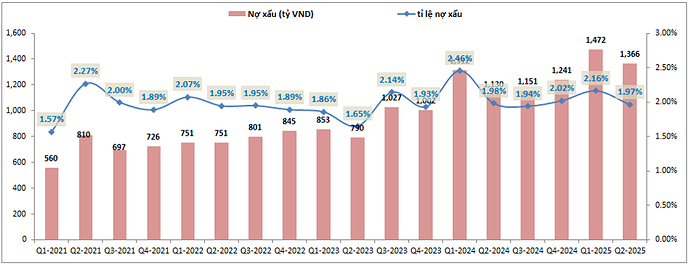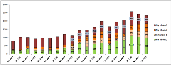 Ngoài ra nợ nhóm 2, nhóm có khả năng hình thành nợ xấu trong tương lai cũng được kiểm soát khá tốt và là quý giảm thứ 2 liên tiếp sau khi ghi nhận mức cao tại Q1-2025. Hiện chỉ còn 984 tỷ đồng. (Hình 7)
