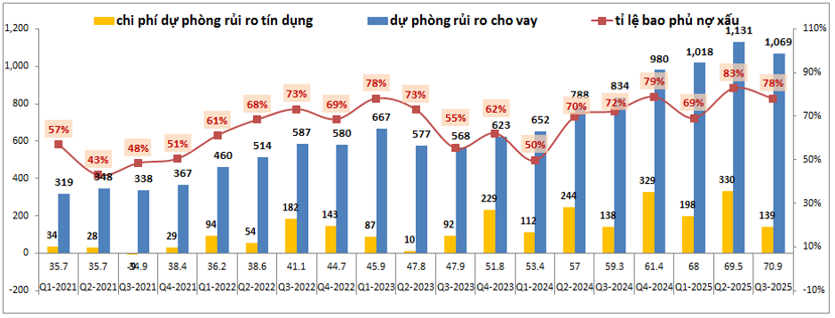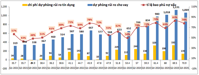 Hiện tỉ lệ bao phủ nợ xấu của KLB là 78% sau Q3-2025, đây không phải mức quá cao những cũng là mức tương đương vùng cao của ngân hàng trong các năm vừa qua. Điều này có nghĩa khả năng cao KLB không quá mặn mà đẩy trích lập để nâng bộ đệm của mình lên cao nhiều nữa mà sẽ xu hướng duy trì trích lập đi ngang để đảm bảo tỉ lệ bao phủ nợ xấu trong vùng 80-100% các năm tới.