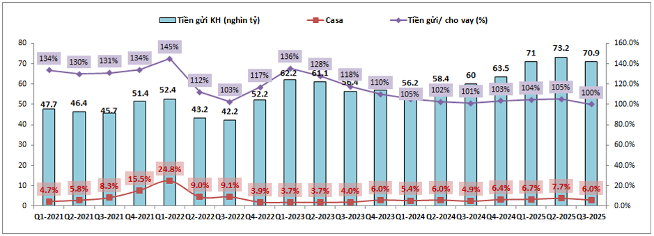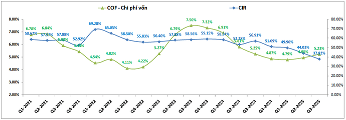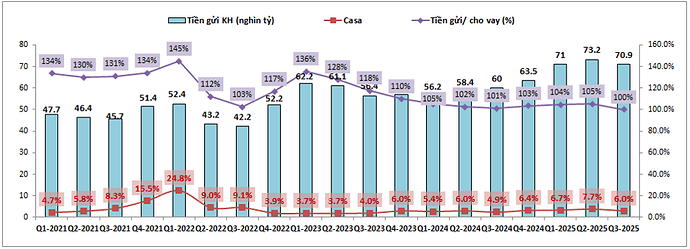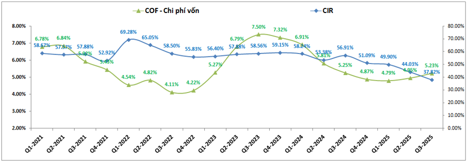 Về tín dụng đầu ra, KLB hiện đang cân bằng khá tốt giữa duy trì tăng trưởng tín dụng ở mức khá cao và vẫn giữ được NIM của ngân hàng ở nền cao chứ không bị suy giảm như đa phần các ngân hàng khác. Điều này có được nhờ KLB đã duy trì đầu vào rất tốt với CIR liên tục tiết giảm trong các năm gần đây từ mức đỉnh 69.28% vào Q1-2022 xuống còn 37.82% trong Q3-2025. COF cũng được kiểm soát tốt và giảm khá nhiều so với nền 2023, đầu 2024. Ngoài ra KLB cũng có lượng tiền gửi cao giúp cho không phải chịu áp lực cạnh tranh huy động đầu vào giúp cho NIM cải thiện rõ rệt. (Hình 2)