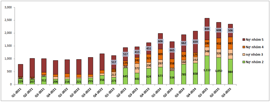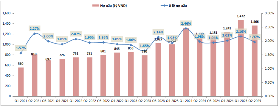 Bức tranh tài chính của KLB vẫn được duy trì khá tốt trong Q3-2025. Tỉ lệ nợ xấu của ngân hàng đã được kiểm soát giảm dưới 2% với 1.97%, giảm khoảng 0.19% so với Q2-2025 trước đó. (Hình 6)