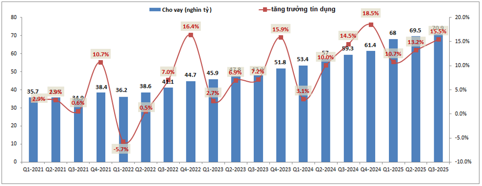 Kết thúc 9 tháng đầu năm, tổng tăng trưởng tín dụng của ngân hàng đã đạt 15.5%, cao hơn mức cùng kỳ là 14.5% nhưng tính ra lại có phần chậm lại sau khi tăng tốc mạnh tại Q1-2025 với 10.7%. Tuy nhiên trong Q4 với lợi thế về huy động đầu vào sẽ giúp KLB hoàn toàn có thể đạt tăng trưởng tín dụng cả năm quanh mức 19-20% để tiếp tục hỗ trợ cho tăng trưởng của ngân hàng. (Hình 3)