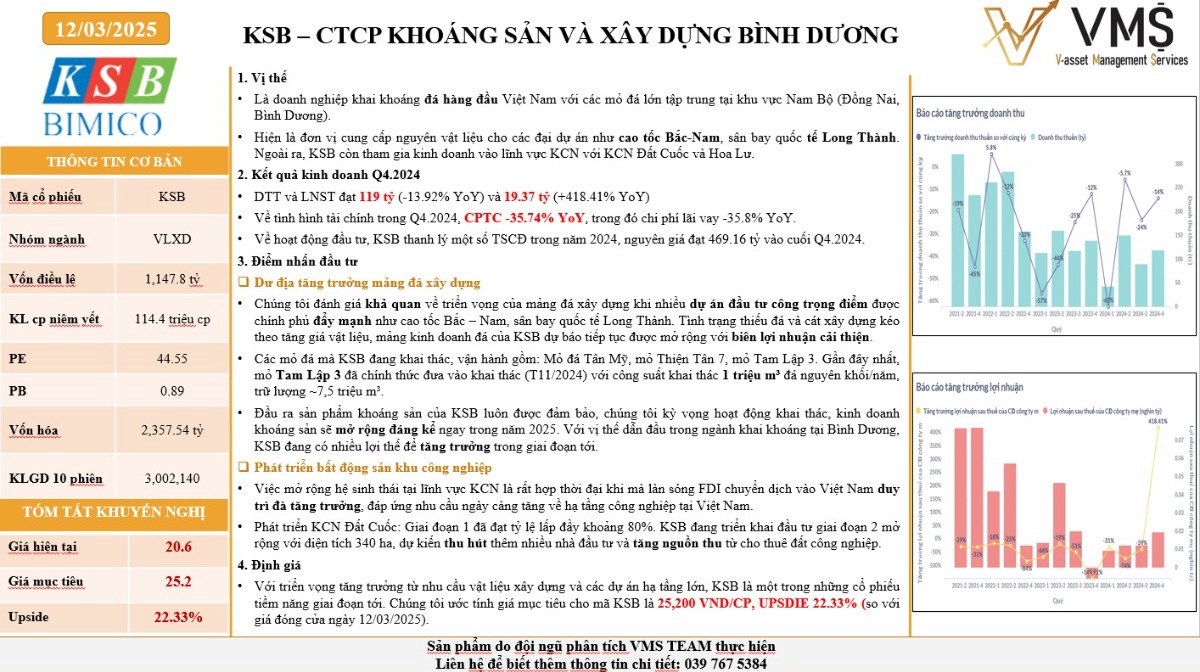 KSB là cổ phiếu hưởng lợi trực tiếp từ đầu tư công và bất động sản KCN. Với tiềm năng tăng trưởng mạnh, chúng tôi định giá KSB ở mức 25.200 đồng/cp, upside 22.33% so với giá đóng cửa ngày 12/03/2025.