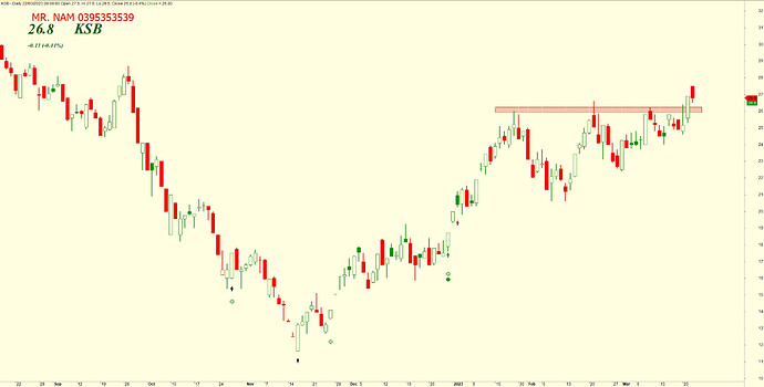 • KSB vừa vượt kháng cự quanh 26 thành công kèm thanh khoản đột biến, sau 3 lần thất bại liên tiếp trong vòng 2 tháng. Cho thấy lực cầu của Cổ phiếu là khoẻ và liên tục đẩy Cổ phiếu lên. Độ biến động của Cổ phiếu này cũng đang thu hẹp dần đi.