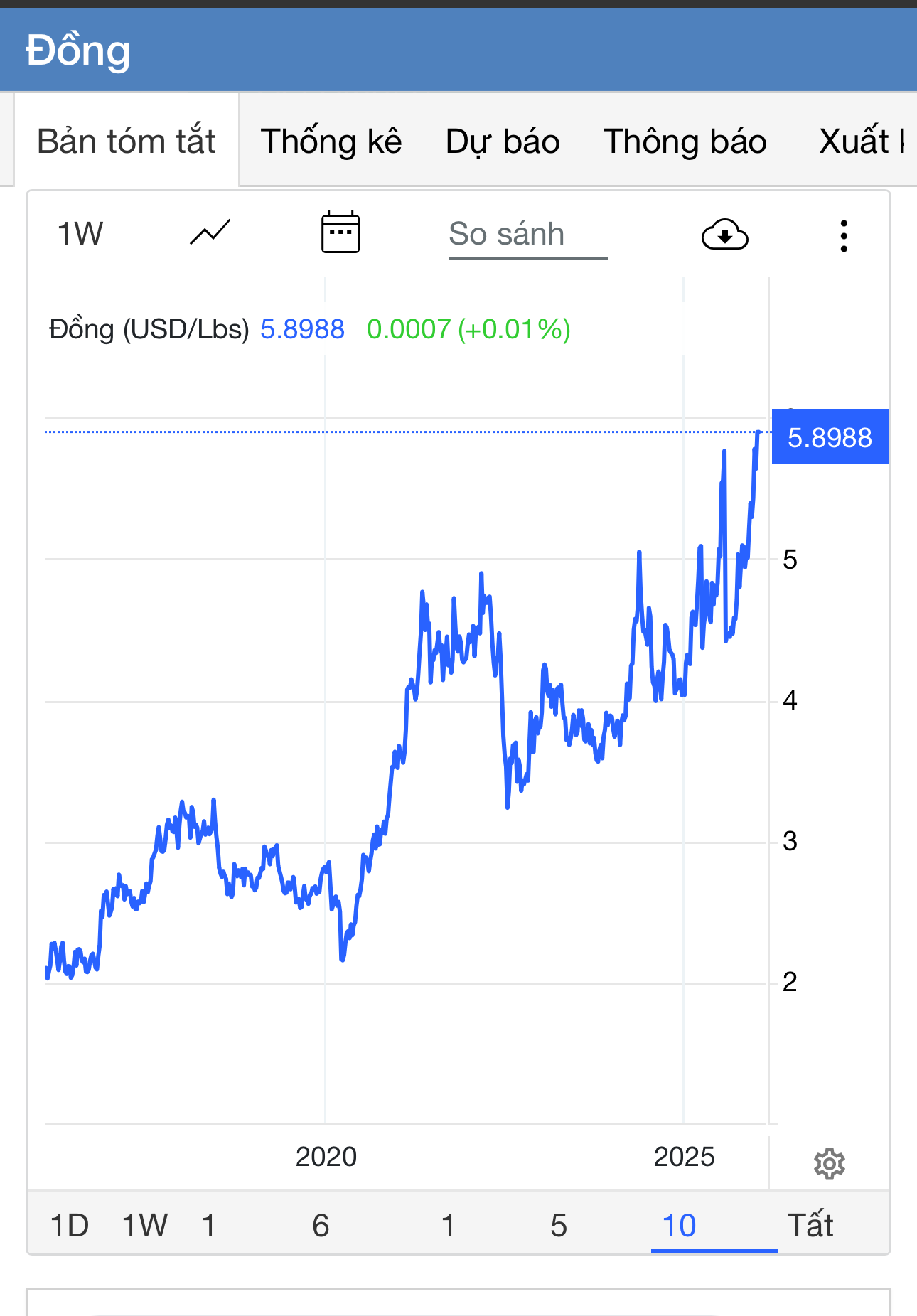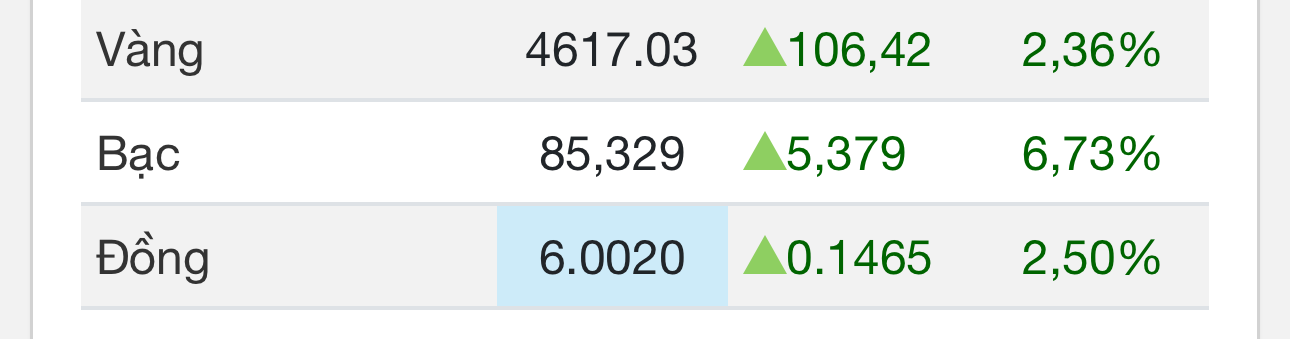 Giá đồng đã tăng lên 6 USD/pound vào ngày 12 tháng 1 năm 2026, tăng 2,41% so với ngày hôm trước. Trong tháng qua, giá đồng đã tăng 12,06% và tăng 39,41% so với cùng kỳ năm ngoái,