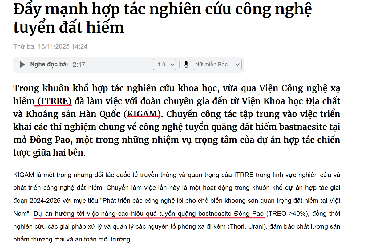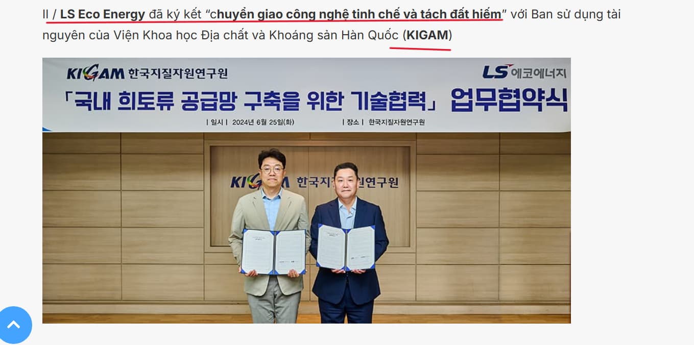 Viện khoa học địa chất và KS Hàn Quốc ( KIGAM ) hợp tác với Viện Khoa học Địa chất và Khoáng sản Việt Nam, Viện Công nghệ xạ hiếm…