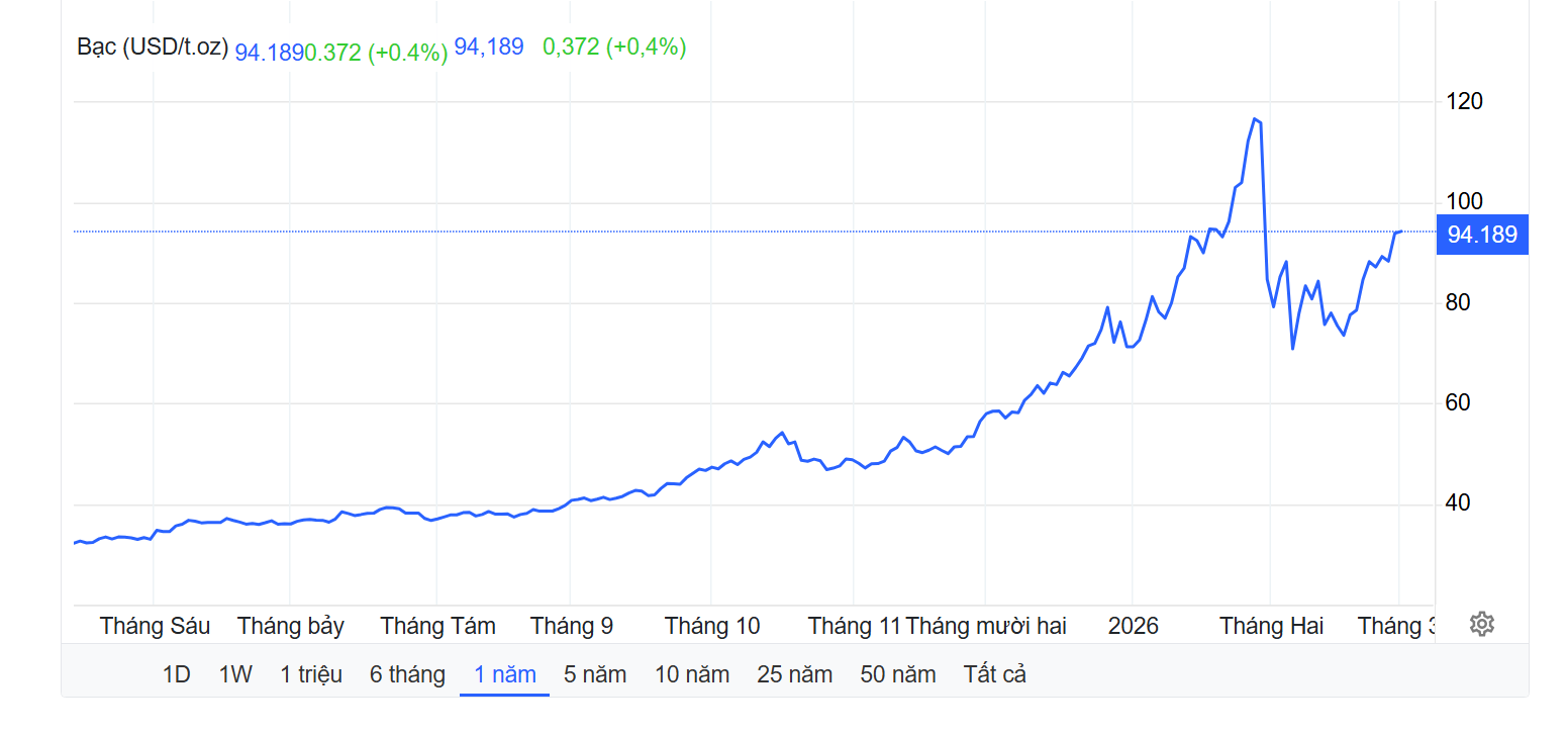 Giá bạc đã tăng lên 93,94 USD/tấn ounce vào ngày 2 tháng 3 năm 2026, tăng 0,13% so với ngày hôm trước.