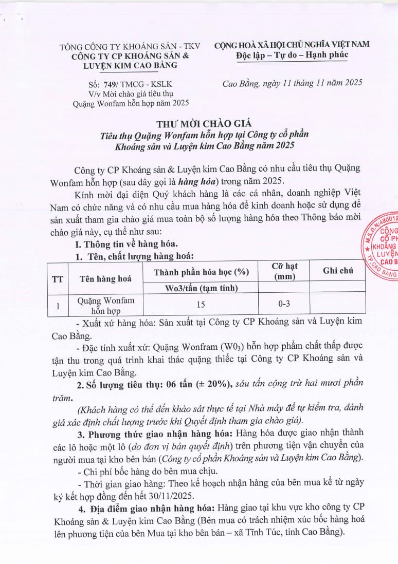 kcb bán 6 tấn quặng Vonfram.