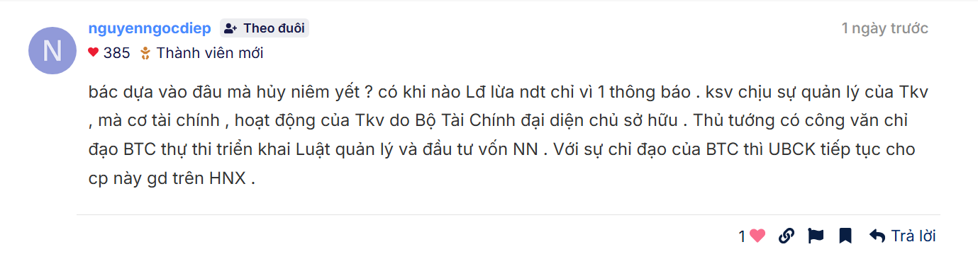 bác dựa vào đâu mà hủy niêm yết ? có khi nào Lđ lừa ndt chỉ vì 1 thông báo . ksv chịu sự quản lý của Tkv , mà cơ tài chính , hoạt động của Tkv do Bộ Tài Chính đại diện chủ sở hữu . Thủ tướng có công văn chỉ đạo BTC thự thi triển khai Luật quản lý và đầu tư vốn NN . Với sự chỉ đạo của BTC thì UBCK tiếp tục cho cp này gd trên HNX .