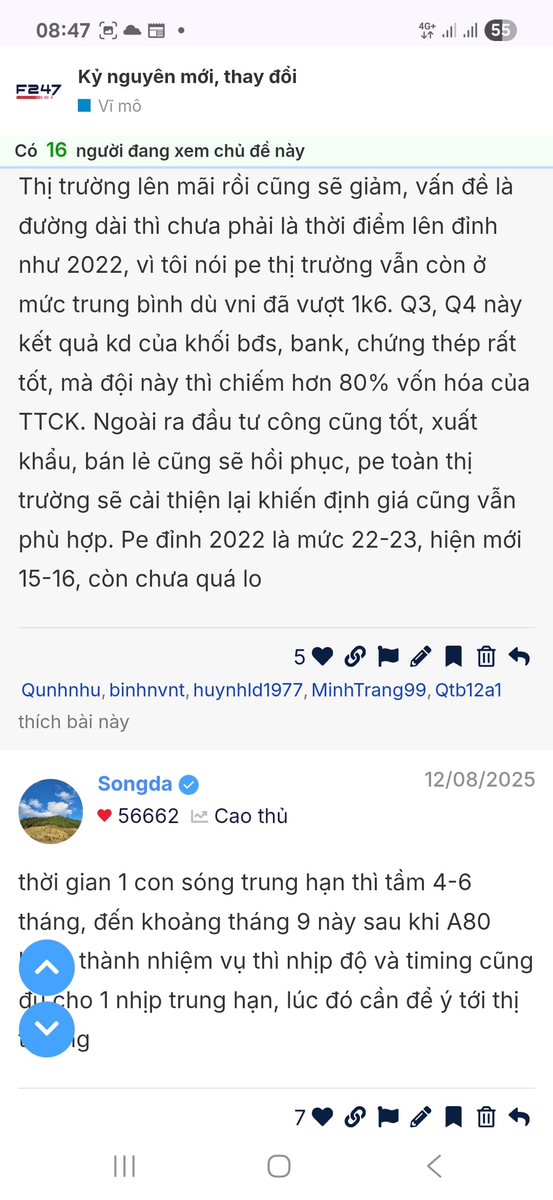 Cuối tuần nói chuyện 1 chút về VNI. Tháng trước tôi nói VNI dù lên cao nhưng pe mới 16 thì ở mức trung tính và dự báo các dn cuối năm có kqkd tốt thì pe forward của thị trường sẽ giảm. Đến giờ vẫn giữ quan điểm, dự phóng pe forward hết Q4 cỡ 11-12. Như vậy dư địa thị trường lên tiếp 25-30%. Tất nhiên trong ngắn hạn và trung hạn thì có những rủi ro điều chỉnh. Nâng háng là khó, vậy thì hành xử tốt nhất là hạ tỉ trọng cp, giữ sức mua và chuẩn bị trước danh mục cp tiềm năng. Chờ đến vùng giá thích hớp sau điều chỉnh thì mua. Được nâng háng thì đua mà không nâng thì chuẩn bị bắt hàng rơi. Không cần hoảng sợ