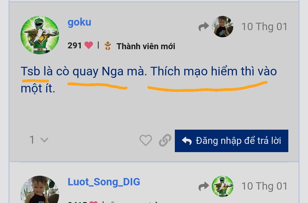 Bằng chứng 3: đăng bài về TSB nói có thể mua nhưng cũng lại kèm câu cò quay nga kkkkk, cái này y như bằng chứng 2, cũng số cô không giàu thì nghèo, sinh con đầu lòng chẳng gái thì trai, nếu giá tăng m sẽ nói m khuyến nghị đúng giá giảm m lại đổ thừa nó là cò quay nga kkkkk.btrình độ k đáng xách dép cho thớt chủ lòng đất nữa mà thích khịa người ta, đã vậy còn láo toét thấy ai nói khách quan cũng chụp mũ nick ảo kkkkkk hèn gì đâu có dám tự tin cá độ đâu
