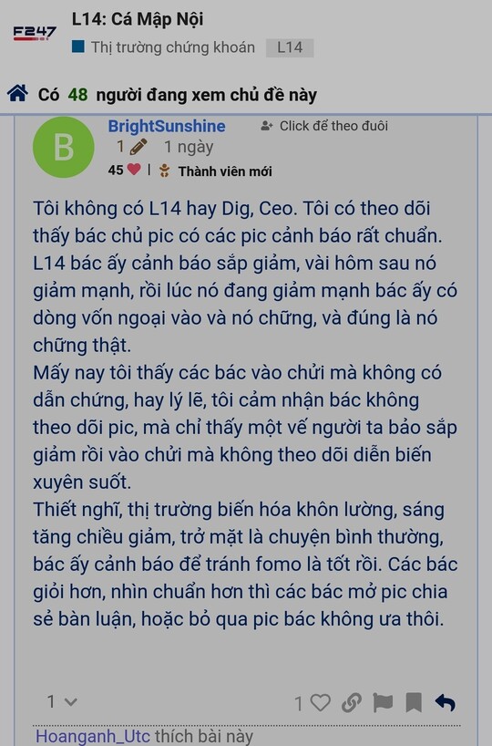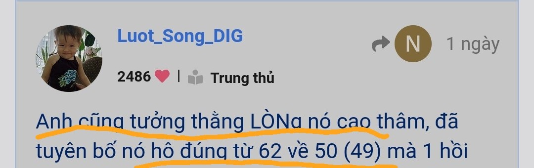 Sau khi xem xét từ đầu tới cuối t thấy mr Nguoivetulongdat hay N971a không có lươn gì cả, m mới lươn đấy go cu, ngay cả thằng nước nóng Dig cũng xác nhận bên trên N9 đúng khi 62 về 50 sau khi thớt đăng chỉ 4 ngày, đồng minh của m còn xác nhận đúng về vụ L14 thì m cãi cái gì, còn vụ HNx thì t đã hỏi mấy lần m vẫn kiên quyết nó giảm, cả vn30 m cũng hô giảm cực lực 4 ngày trước nhưng kết quả đã rõ rồi, hôm nay là hạn 4 ngày nha. đáng ra nay t có thể chửi m thậm tệ như đã hẹn do m đoán sai, nhưng thôi giao thừa tới nơi rồi nên t bớt khẩu nghiệp. kkkkkk chẳng qua m nhắc tên t nên t rep thôi đấy