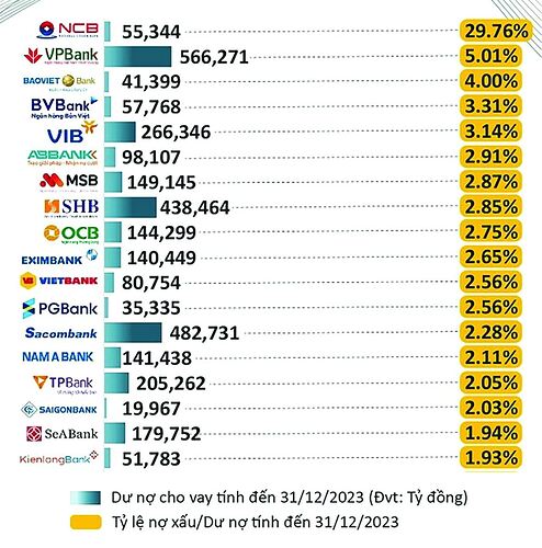 Tỷ lệ nợ xấu một số ngân hàng tính đến 31/12/2023. Nguồn: Vietstock