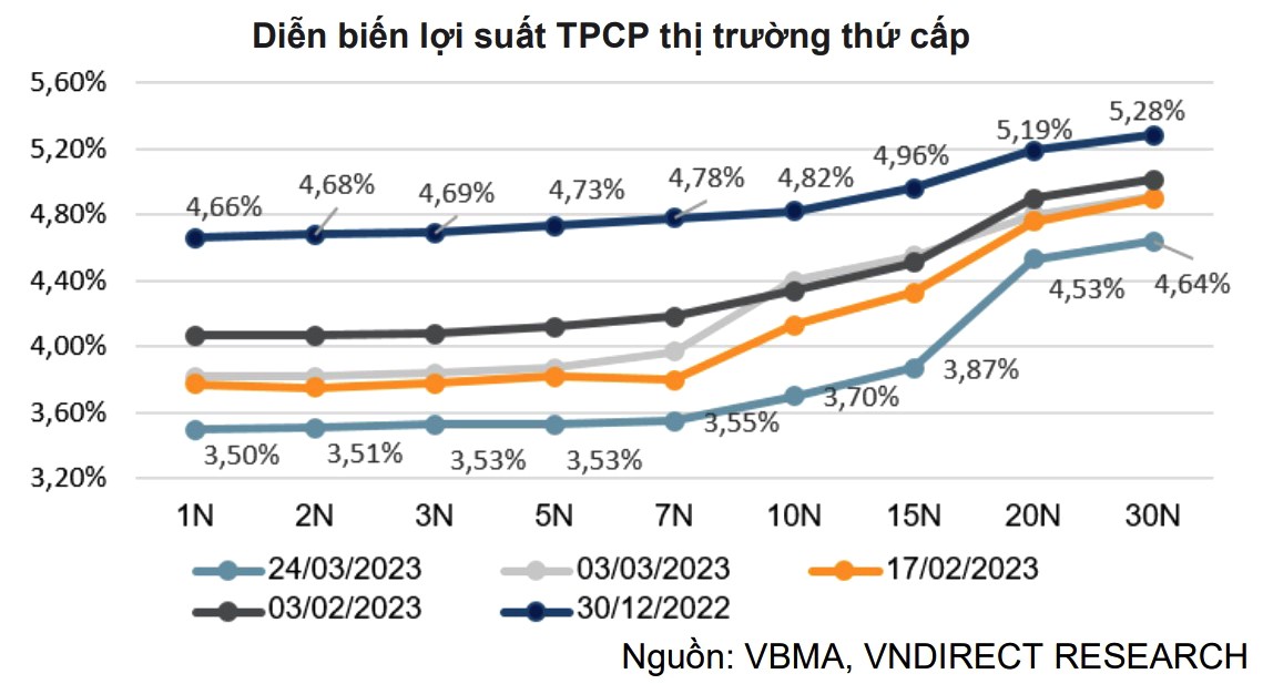 Cũng như trên thị trường sơ cấp, lãi suất trái phiếu chính phủ trong quý I/2023 cũng có xu hướng giảm mạnh ở tất cả các kỳ hạn, nhất là sau động thái giảm lãi suất điều hành từ Ngân hàng Nhà nước.