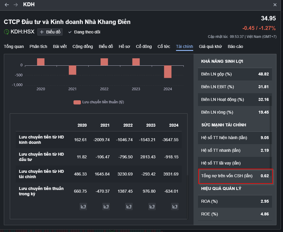 2. Sức khỏe tài chính: Top 1 sự an toàn Trong đầu tư, mình luôn soi kỹ Bảng cân đối kế toán. KDH hiện là doanh nghiệp có tỷ lệ Nợ vay/Vốn chủ sở hữu thấp nhất ngành.