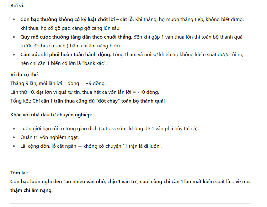 E nghĩ vì họ ko biết đủ, tài lanh đòi gắp phần (mồi) của nái. Mà nái càng bỏ ra nhiều mồi, thời gian càng kéo dài thì khả năng bank xác càng cao Ka ạ. 9 trận thắng chưa hẳn do mình giỏi mà là do được cho ăn. Trận thứ 10 vẫn nghĩ mình giỏi nên gia tăng nav và … đòm. Cái chết bank xác ko xảy ra ở vùng đỉnh hay vừa qua đỉnh mà xảy ra ở khúc hồi thứ n sau đó.