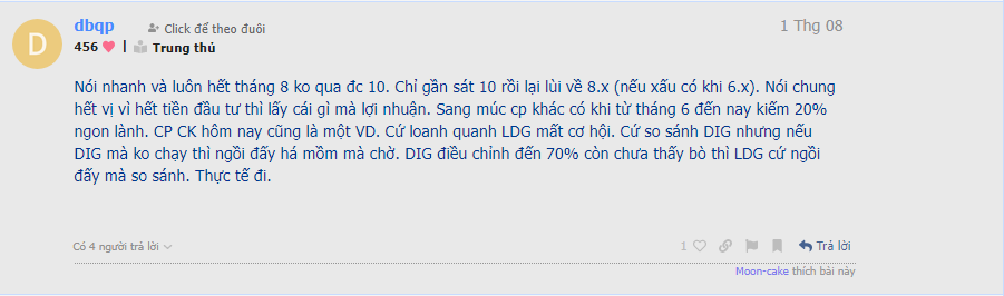 Mầm non mới nhú mà vội chốt lời, xét về mô hình thì LDG vừa mới chớm breck khỏi Nền giá. TT trong uptrend phải có chỉnh mới tạo xung lực đi lên. Nếu nó rũ mà bạn chốt thì tâm lý mua luôn lại k bao giờ có, bạn sẽ phải mua đuổi. Cái tâm lý này đến nhà đầu tư có kinh nghiệm còn rất dễ mắc phải. Do đó nếu chưa tìm được mã nào tốt hơn thì nên lì đòn với những nhịp rung nhé. VD sáng phiên 5/8 cũng kha khá nhỏ lẻ bị rung rơi mất giá 10.25, 10.3 mà tôi dám chắc 7-80% số đó đang chờ đợi nó xuống thêm để múc lại, nhưng LDG bật lại luôn và thế là mất hàng thôi.