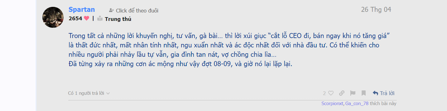 Tôi đọc cm thì thấy cậu ta k nhất quán, lúc thì chê A7 thánh gì ấy k nhớ; rồi k nên để mọi ng nghĩ ldg có qhe vs dig ceo của A7…nhìn chung tôi đánh giá thì cậu ấy cũng chỉ là dân trade theo ptkt thôi, mfi trên 80 hô mua thì ăn chỉnh khá cao. Hô hào để trade chứ kp nđt chiến lược, tinh binh gì hết. Hay cách cậu ấy nhìn nhận cậu Mrdata là tôi biêt, Mrdata chỉ lướt thôi có phải dân đtu gtri đâu; nói chung luận điểm của cậu này là gió chiều nào xoay chiều ấy, k đáng tin. Lúc đầu tôi cũng tôn trong xong càng ngày thấy k đc hay cho lắm.
