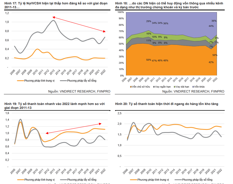 Sức khỏe tài chính của các Doanh nghiệp này hiện tốt hơn so với giai đoạn 2011-13 với tỷ lệ đòn bẩy thấp hơn và khả năng thanh toán nhanh khỏe hơn. Tỷ lệ hàng tồn kho vẫn duy trì mức cao nhưng HTK/TTS đã thấp hơn nhiều giai đoạn trước → Áp lực vơi bớt.