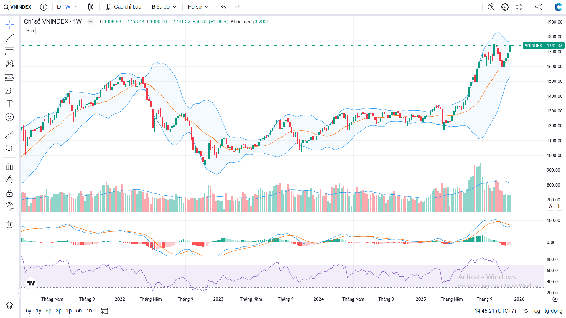 Tuần giao dịch đầu tiên của tháng 12 từ 1-5/12 là tuần thứ 4 liên tiếp tăng điểm hồi phục từ vùng MA20 tuần. VNI tăng điểm mạnh nhất trong 4 tuần gần đây khi kết tuần tại 1741.32đ, tăng 50.33đ (+2.98%) so với tuần trước đó.