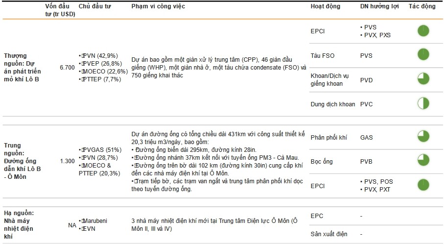 Với vòng đời dựán kéo dài 20 năm, chúng tôi tin rằng dựán Lô B–Ô Môn sẽlà động lực tăng trưởng lớn cho nhiều DN niêm yếttrong chuỗi giá trịngànhdầu khí tại Việt Nam trong thời gian tới.Trong đó, các doanh nghiệp thượng nguồn như PVS, PVD được đánh giá sẽ hưởng lợi lớn từ nhiều thành phần của dự án.
