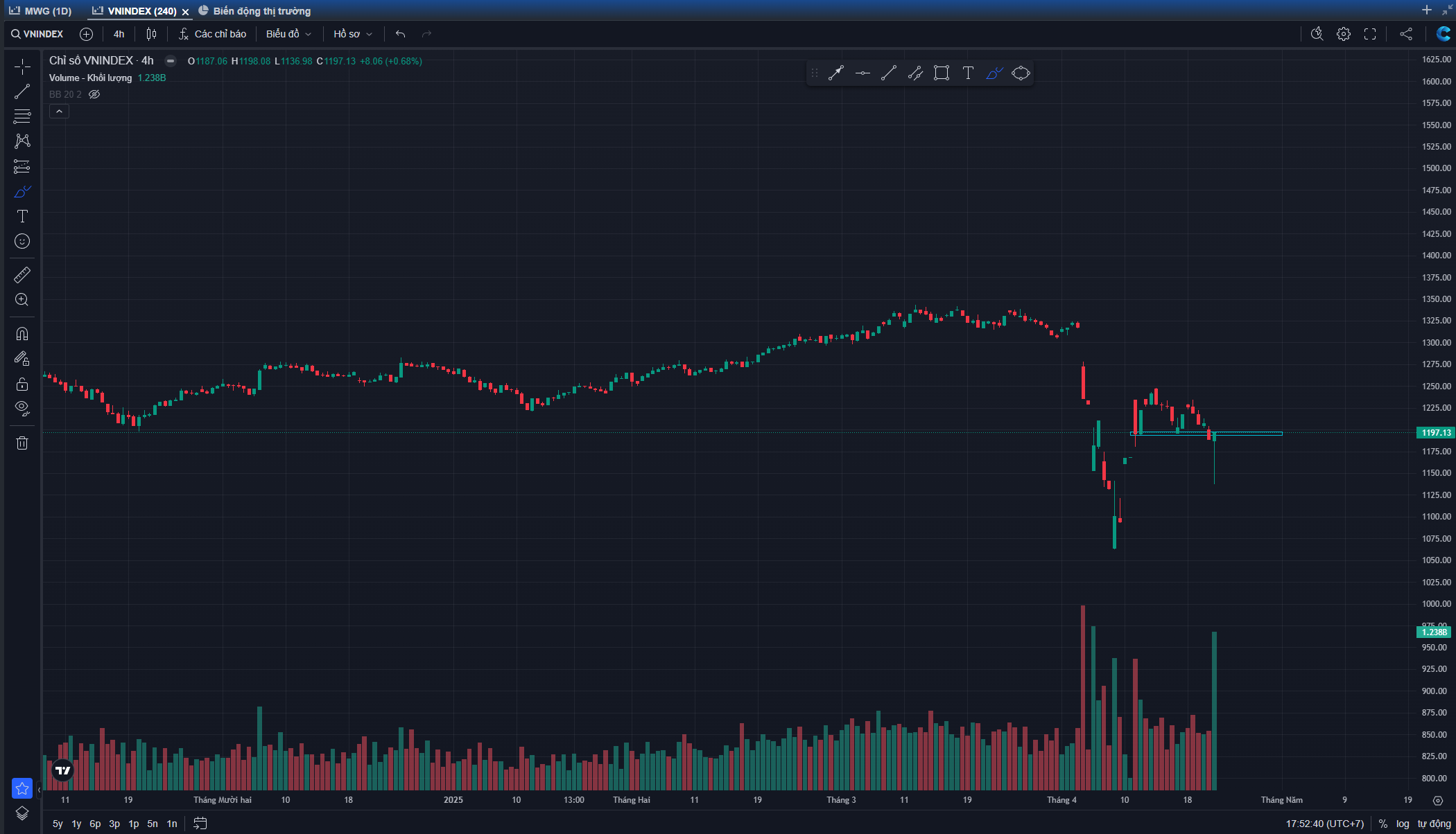 (4) Phản ứng mạnh ở 1140 1150 thì có dáng dấp đáy 2 rồi nhưng không nên kỳ vọng có sóng tăng mạnh ngay bởi như đã pt, tt đang thiếu động lực và Trump vẫn hằm hè nắn gân VN. Ngay hôm nay hồi 50 điểm, chủ yếu là kéo trụ, trong khi mid vẫn nằm sàn, KCN, thép, BĐS, …. Dòng nào tiên lượng kém vẫn bị bán mạnh tay. nên anh em không cần lo lỡ tàu. Đoạn này dự kiến sẽ lình xình và tiếp tục phân hóa , rà soát lại danh mục, đối chiếu BCTC Q1, cổ mạnh hay yếu khi rung lắc và hồi phục sẽ dễ nhận biết