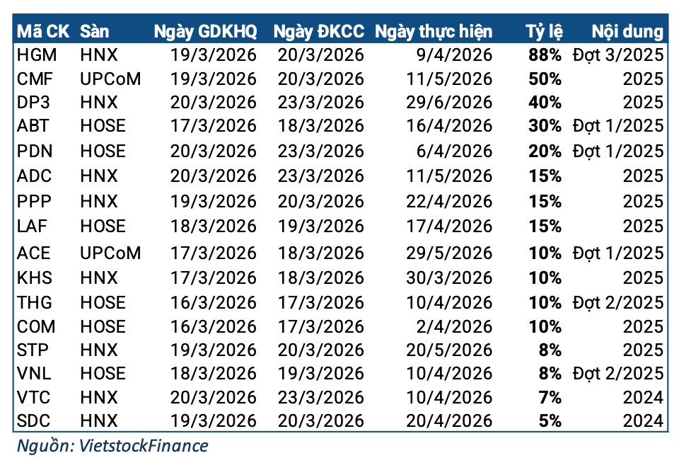Ở nhóm cổ phiếu cổ tức cao trong thời gian tới, đáng chú ý nhất là HGM Mining. Doanh nghiệp dự kiến tạm ứng cổ tức đợt 3/2025 với tỷ lệ 88%, ngày giao dịch không hưởng quyền là 19/03 và thanh toán dự kiến vào 09/04. Trước đó, công ty đã chi trả hai đợt cổ tức với tỷ lệ 45% và 85%, nâng tổng cổ tức năm 2025 lên tới 218%, một mức rất hiếm trên thị trường.