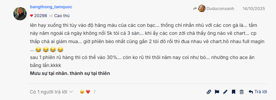 Thông đã lên bài. cảnh tỉnh những ace mới bước chân vào tt… nhịp này đang đua lệnh thì cơ cấu danh mục. báo cáo quý 3 ra. cp phải ánh hết vào giá rồi… ai có hàng chốt. thì ace hăng máu cơ… hazz