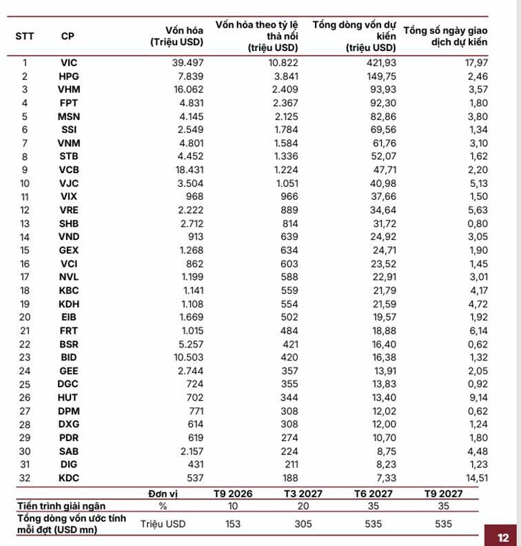 Ở cấp độ cổ phiếu, các mã thành phần sẽ được thêm vào theo tỷ lệ dựa trên vốn hóa tự do (free float) qua từng giai đoạn, tuân thủ các yêu cầu sàng lọc tiêu chuẩn của FTSE về tính thanh khoản, ngưỡng vốn hóa và giới hạn sở hữu nước ngoài.