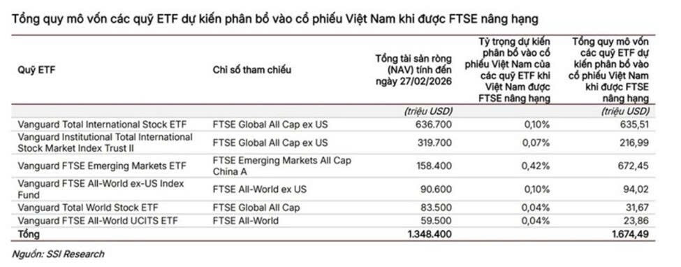 Ước tính hiện tại từ FTSE cho thấy Việt Nam sẽ chiếm khoảng 0,23% trong chỉ số FTSE Emerging Index và 0,35% trong chỉ số FTSE Emerging All Cap Index. Mặc dù tỷ trọng này tương đối khiêm tốn, nhưng nó khẳng định vị thế ngày càng quan trọng của Việt Nam trong danh mục phân bổ vào các thị trường mới nổi. Theo đó, dòng vốn dự kiến từ các quỹ ETF thụ động có thể rơi vào khoảng 1,44 tỷ USD.
