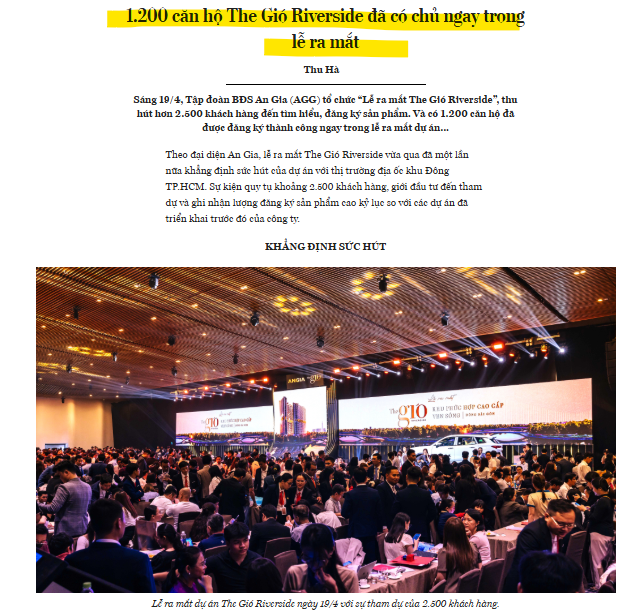 - The Gió Riverside (Dĩ An, Bình Dương, 3,1 ha): 3.000 căn hộ, giá bán 38–40 triệu đồng/m², tỷ lệ hấp thụ sản phẩm giai đoạn 1 gần như 100%. Dự án dự kiến mang lại 7.000 tỷ đồng doanh thu và 1.200 tỷ đồng LNST cho An Gia trong giai đoạn 2026–2027.