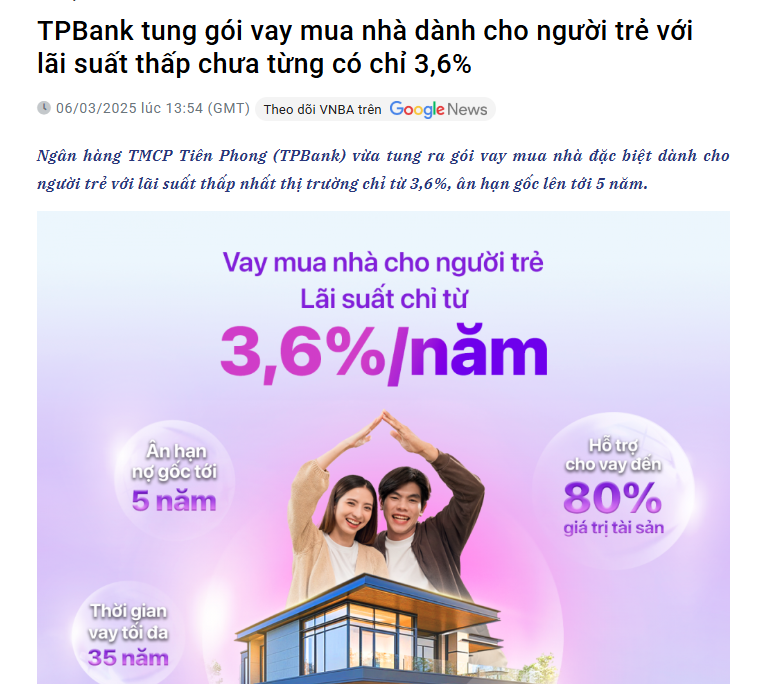 - Hỗ trợ đặc biệt cho nhóm người trẻ: Một số chính sách đặc biệt hỗ trợ mua nhà cho người dưới 35 tuổi đang nhận được sự quan tâm lớn, bao gồm ưu đãi lãi suất giảm thêm 0,5–1% và kéo dài thời gian vay lên đến 30 năm, nhắm đến nhóm khách hàng gia đình trẻ có nhu cầu an cư nhưng tài chính còn hạn chế.
